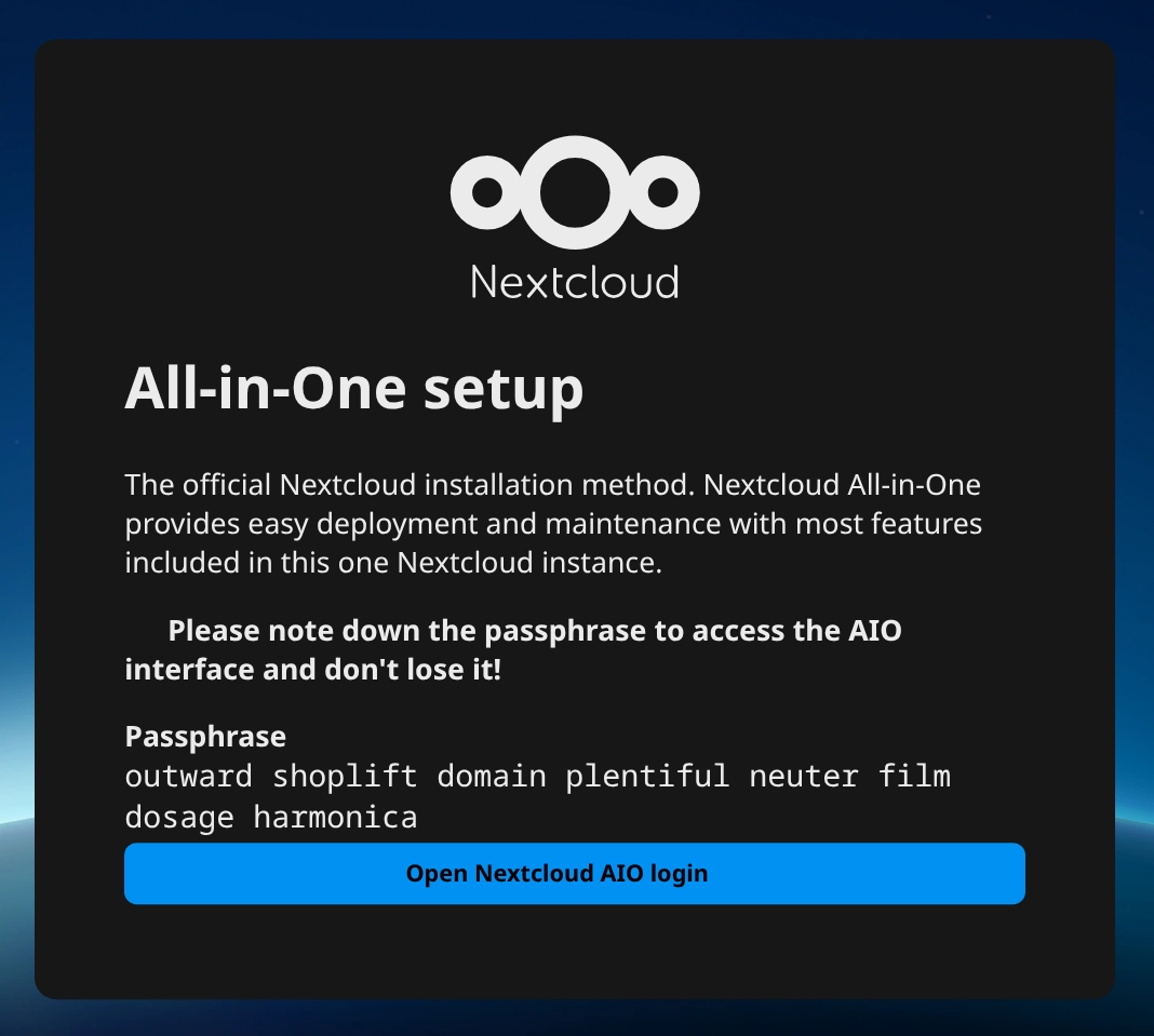 Una vez que todos los contenedores estén descargados e iniciados, puedes dar clic en Open your Nextcloud. Pero primero, copia la contraseña de administrador y guárdala en un lugar seguro. Por favor usa un gestor de contraseñas. Si no tienes uno, yo personalmente uso y recomiendo Bitwarden.